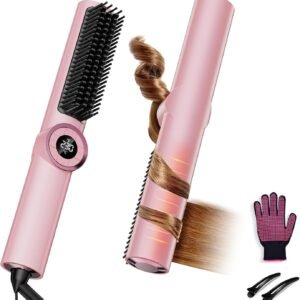 Hair Straightener Brush: 3-in-1 Curling & Straightening Comb with Dual Voltage, Hot Comb with Ionic Coating, Pink